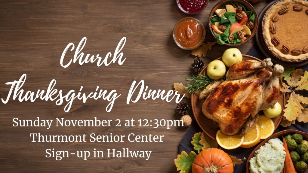 We will be celebrating Thanksgiving as a church on Sunday, November 2, immediately after the morning worship service.  We will be over at the Thurmont Senior Center.  Please plan to bring a side dish and dessert to share.  The church will be providing turkey. Please signup in the hallway to make sure we have enough turkey!