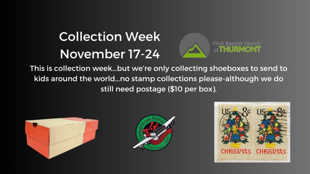 We are collecting boxes for Operation Christmas Child during the week of November 17-24